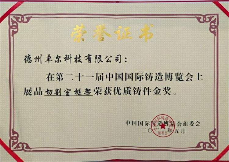 此次參展鑄件榮獲金獎,是德州卓爾科技有限公司作為“高新技術(shù)企業(yè)”、“山東省創(chuàng)新型中小企業(yè)”、“山東省科技型中小企業(yè)”、“山東省專精特新中小企業(yè)”的實力證明。德州卓爾科技有限公司將以此次參展鑄件榮獲金獎為契機,不斷加大科技研發(fā)投入,強化技術(shù)創(chuàng)新,增強核心競爭力,促進行業(yè)轉(zhuǎn)型升級,持續(xù)推動公司高質(zhì)量發(fā)展,為區(qū)域經(jīng)濟發(fā)展做出新的更大的貢獻。